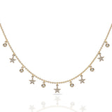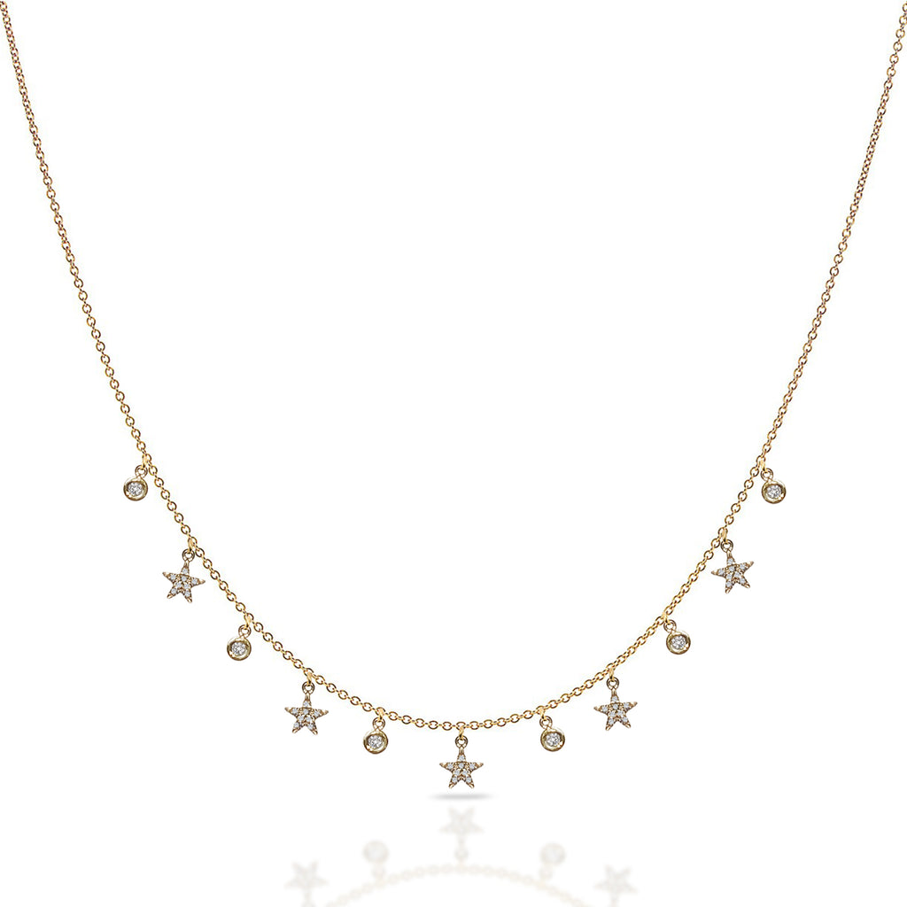 Glittering bezel set diamonds set between pave set stars stationed along a delicate chain to create a floating look. Perfect for layering. Chain is a 16" with 2" extension