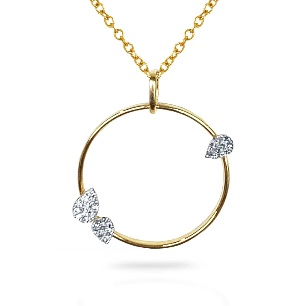 Modern open circle diamond necklace with drop shape pave discs in 14k two tone gold