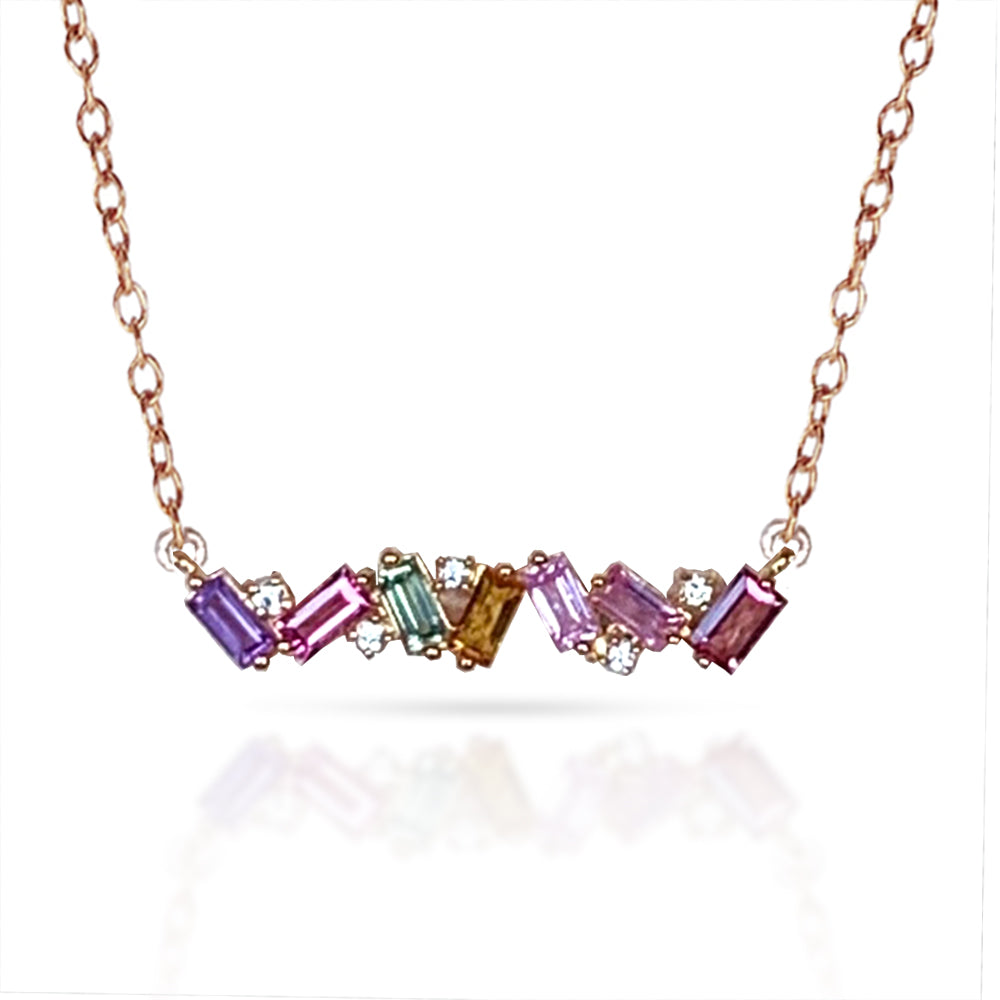 Unique horizontal bar necklace set with multi color baguettes in 14k solid gold with five small diamonds sprinkled in between