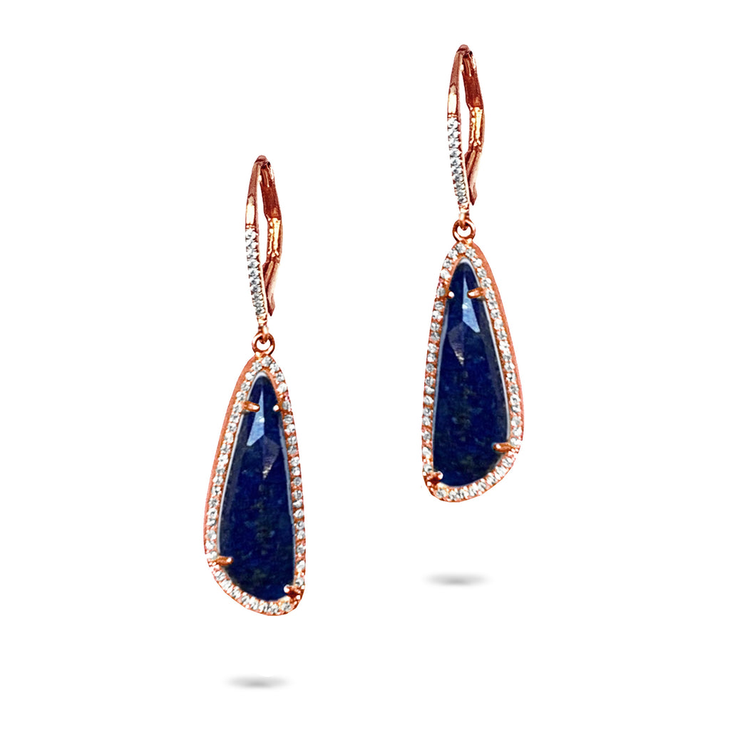 blue lapis remains the symbol of royalty and honor, spirit and vision. It is a universal symbol of wisdom and truth. This vertical irregular trillion earrings is surrounded by small brilliant diamonds pave set in 14k solid gold.